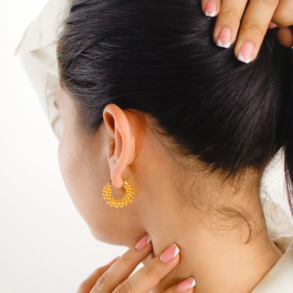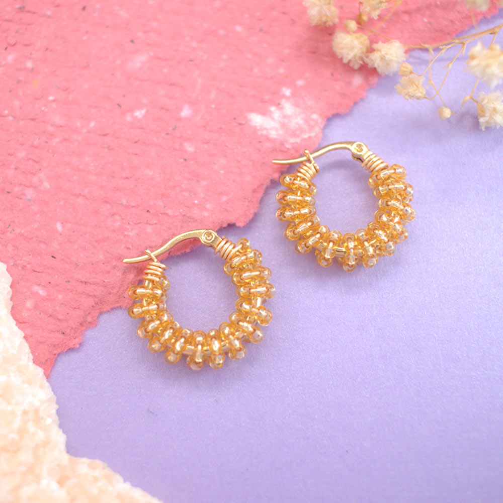 Candonga pequeña, con un exquisito tejido de mostacilla que mide aproximadamente 1,5 cm. Te ofrecemos una amplia gama de opciones de colores para que puedas elegir la que más te guste. Si deseas obtener más información sobre los colores disponibles, no dudes en contactarnos a través de WhatsApp.